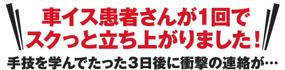 しかし、この治療法なら、手技を学んだばかりの一般の治療家さんが、医師に手術宣告されるほどの痛みのせいで車イス生活だった患者さんを1回で立たせる…なんてことが当たり前になります。実際に、このような報告は1件や2件ではありません。