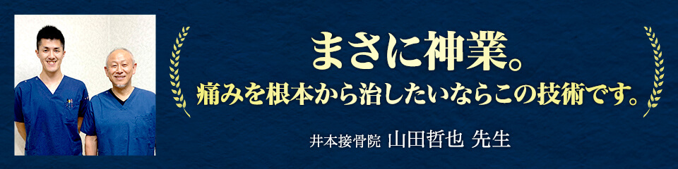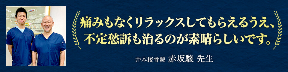 私が人生に希望を持てたのは、井本先生のおかげです。「神の手」だと思っています。井本先生の経験と探求心が素晴らしい技術を作っているんだと思います。これからもよろしくお願いいたします。