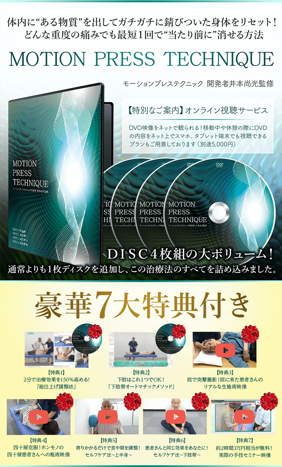 | どんな重度の痛みでも最短1回で“当たり前に”消せる方法 『MOTION PRESS TECHNIQUE』DVD(監修:井本尚光) |