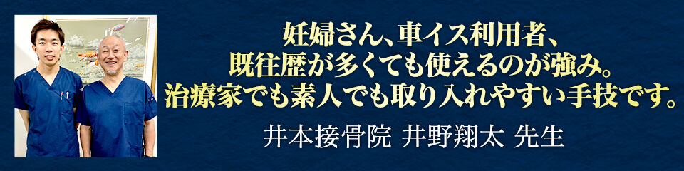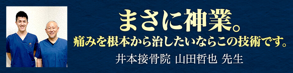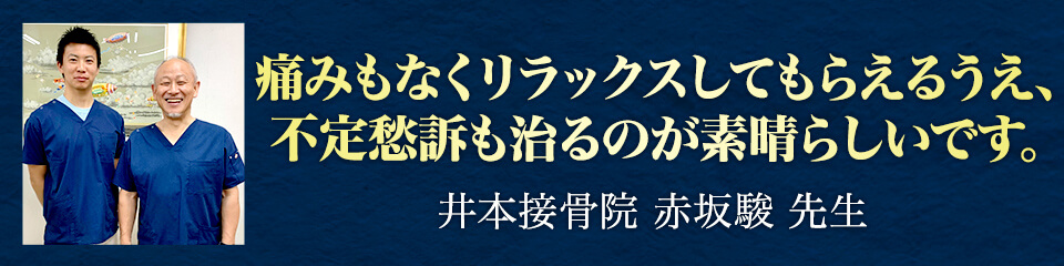 私が人生に希望を持てたのは、井本先生のおかげです。「神の手」だと思っています。井本先生の経験と探求心が素晴らしい技術を作っているんだと思います。これからもよろしくお願いいたします。